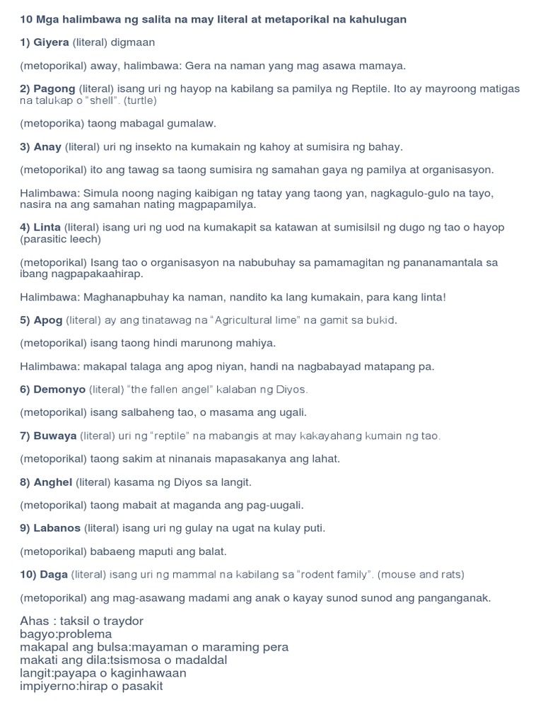 Jan 02 2021 Metaporikal na kahulugan. Oct 28 2019 Correct answers.
