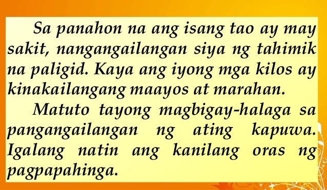 Sa mga pagkakataon na nagpapahinga ang isang tao lalo na kung siya ay may sakit kinakailangan natin siyang igalang. Pamamahala sa paggamit ng oras ang oras ay kaloob na ipinagkatiwala ng diyos sa tao ano ang kahulugan nito. Sa pag-uwi niya sa hapon bitbit niya ang maraming aklat na babasahin.